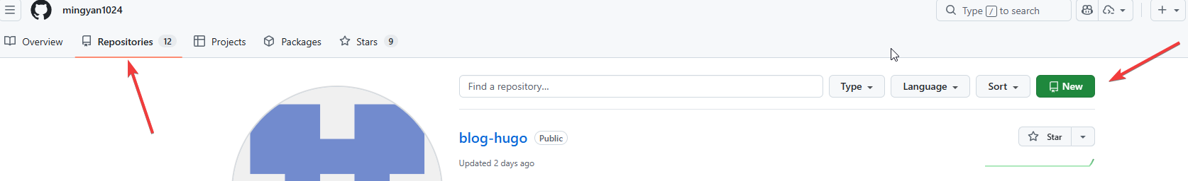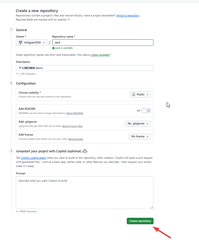 点击 new ,填写完配置信息后,即可创建一个个人仓库。