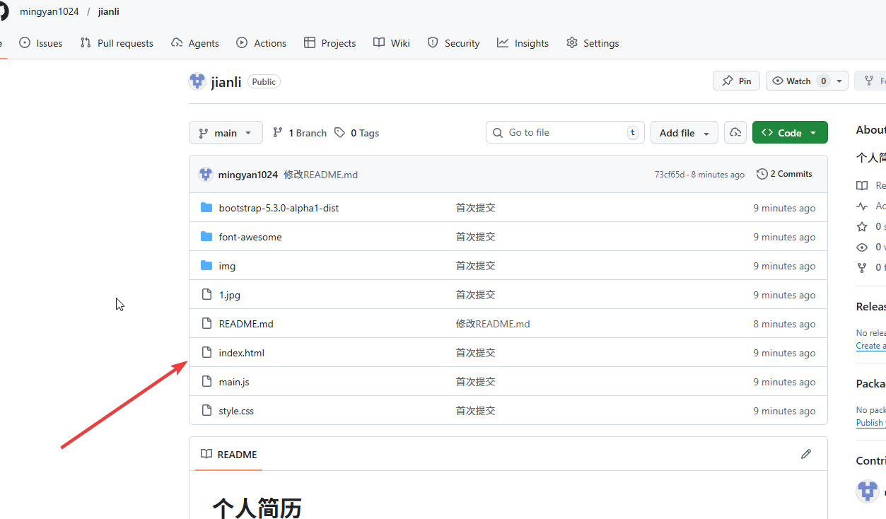将你的静态网页代码提交上去,一定一定要注意:必须要有 index.html。另外,这个项目的访问权限一定要配置成public(默认的)。