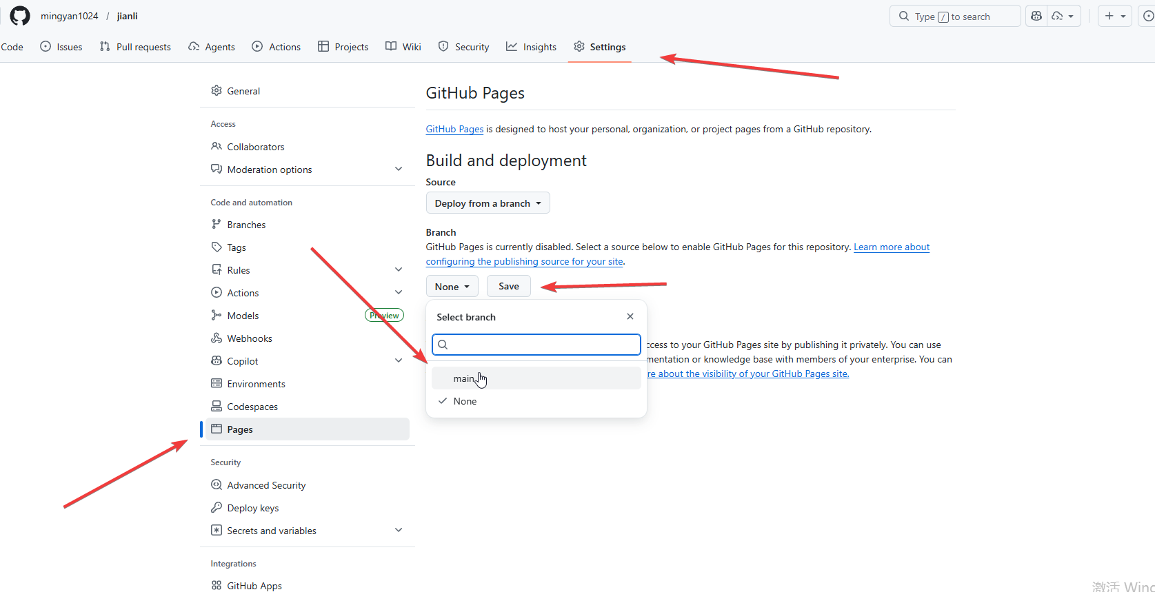 在仓库主页面,找到setting,找到page,找到main,选中之后,点击save。