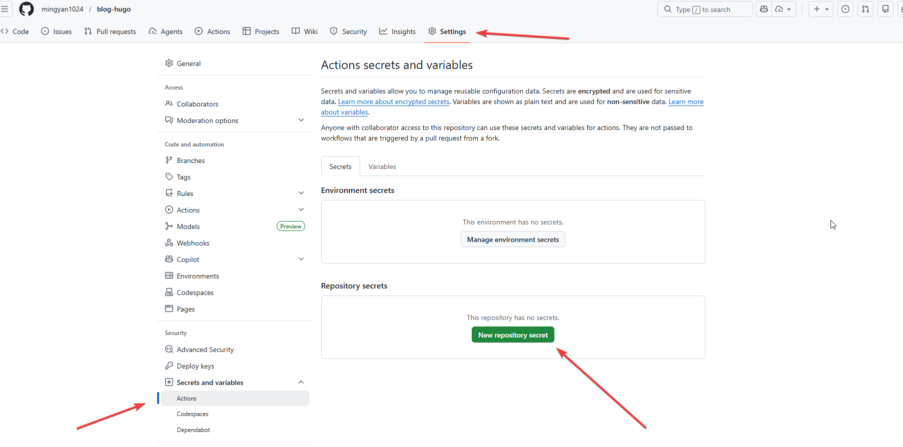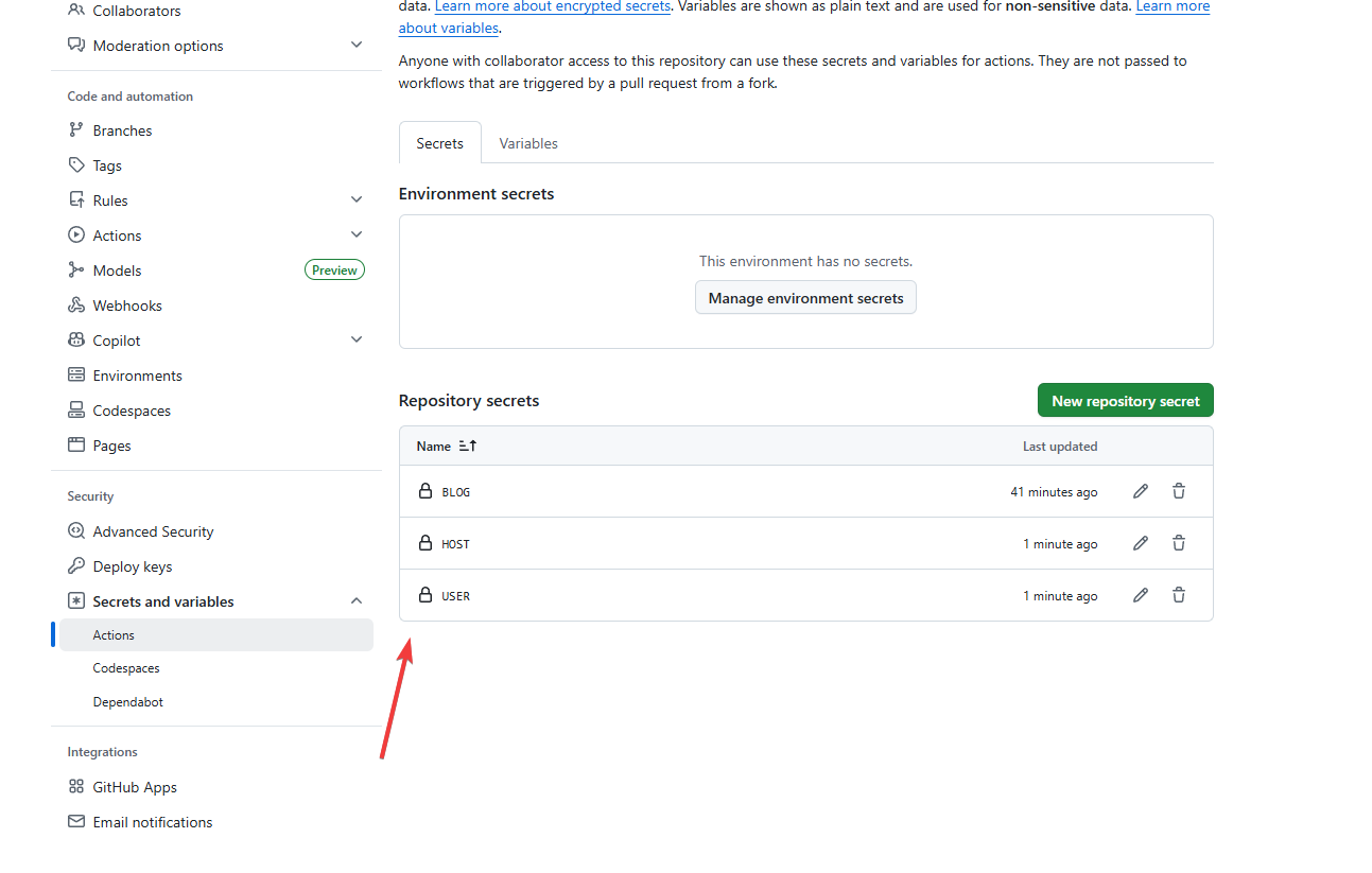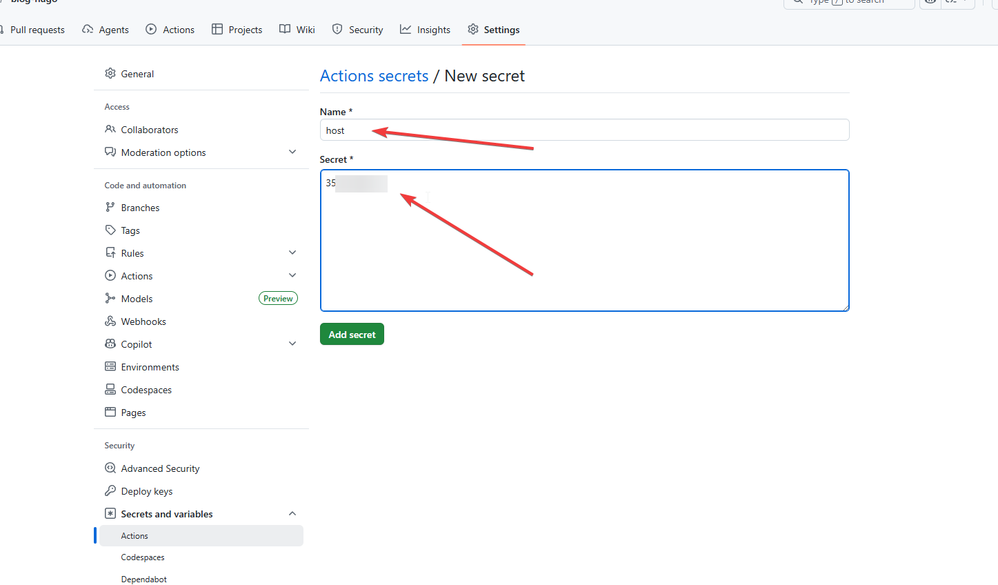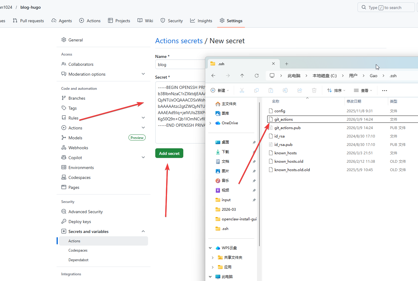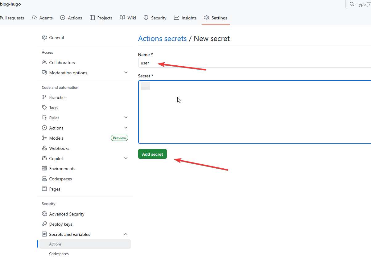 打开博客的git仓库,找到如下配置页面。然后,把 git_actions 文件里面的内容,完整地粘贴进来。点击 add secret 保存。如下图所示。