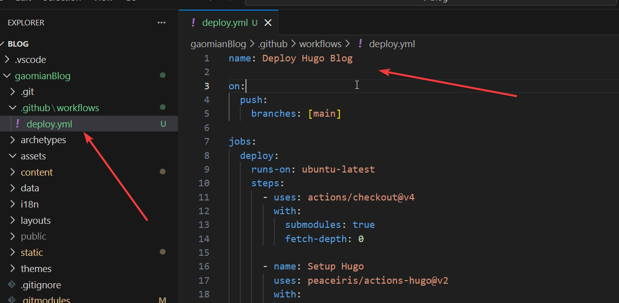 在本地的项目目录下,创建一个.github/workflows/deploy.yml这样一个文件。